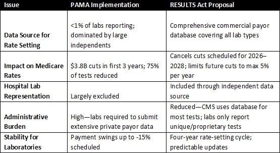 Bottom line: The RESULTS Act addresses the systemic flaws of PAMA by broadening data sources, reducing administrative burden, and preventing destabilizing cuts to lab reimbursement.